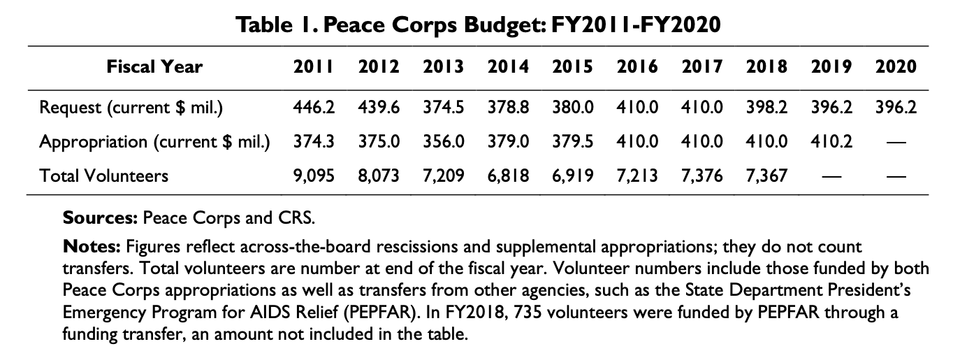 The Peace Corps’ funding has been static at $410 million since 2016.
